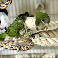Olive is a 1-year-old Quaker Parrot and has a neck cone/tube around her neck and the feathers are missing from the bottom of her right leg. She does have a band but I do not have the number recorded. She answers to “Ollie” or “Olive” and knows how to say many words and phrases, including the names “Giovanna”, “Anthony”, “Mercedez” and “Ollie”