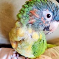 About 1 yr old, I hand raised him and he has an amazing vocabulary. Was sexed as a male blue crown conure and morphed into this colorful mixed breed. Maybe Jenday or sun conure. He’s a little on the larger side for a conure.
