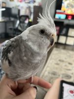 Flighty, loves to sing(catcalls, knows the “cookie cookie” song as well as September but not all the way), usually lands on people’s heads and circles around high places, loves seeds and chips, doesn’t bite, and loves head scratches.