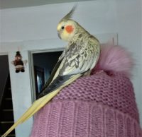 Yellow and grey speckled cockatiel, with orange cheeks and grey crest feathers. Loves millet sprays. He does have a purple band on his left leg.