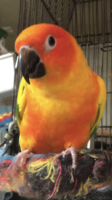 Nine year old male Sun Conure. Aggressive toward strangers, comfortable around owner. About 95% yellow. Has pee-sized injury on right wing, with couple feathers missing and two flight feathers damaged. Band has been removed due to previous injury. Owner will supply complete band information along with paperwork and photos if needed.