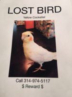 Lou/Louie is a 6 month old male, yellow and white cockatiel. He has a small bald spot on his head.