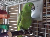 Flew out from her home on July 4th. She is green large parrot. Blackish beak. She does have a leg band on. She is afraid of strangers. Please call if spotted. 317-364-0621 If she is on the ground try to toss a towel over her as she might try to fly off again. She talks a lot. Was last seen up high in the trees and other birds kept chasing her off to other trees.