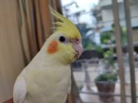 Yellow coloured cockatiel bird with orange coloured circles around the cheeks.